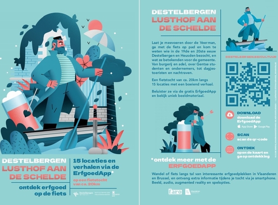 Met de ErfgoedApp op zak kan u in het kader van “Destelbergen, lusthof aan de Schelde” een mooie, interessante en gezonde fietstocht maken van zo’n 20 kilometer langs 15 verschillende locaties in onze gemeente. U wordt in de app begeleid door de Veerman die u met beeld en geluid bij elke stop vertelt wie zoal het Destelbergen en Heusden van de 19 de en 20 ste eeuw bezocht en waarom, van studenten over dagjesmensen langs adel met buitenhuis tot ondernemers.