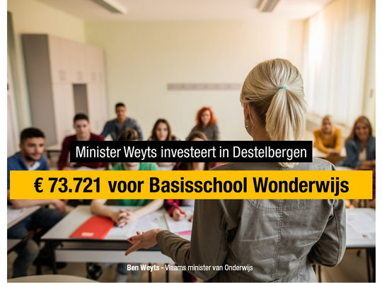 Vlaams minister van Onderwijs Ben Weyts (N-VA) investeert € 73.721 in Vrije Basisschool Wonderwijs in Destelbergen.
